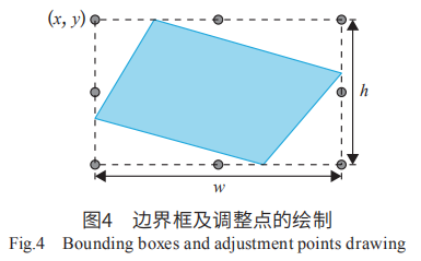 新增整体调整多边形大小状态,通过快捷键 R激活整体调整多边形大小状态,此时将不能编辑多边形单个点,也不能整体移动多边形,鼠标左键点击要整体调整的多边形,激活该多边形的整体调整功能,根据边界框 P(x, y, w, h) 绘制出边界框以及调整点,如图 4 所示,表明可以对当前多边形进行整体调整大小的操作。