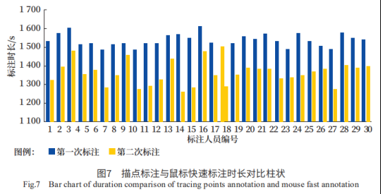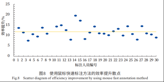 从图 7 中可以看出,在其他标注条件相同的情况下,每个标注人员使用鼠标快速标注方式的标注时间均少于描点标注的标注时间。由图 8 分析可得,76.7% 人员的标注效率提升在 10% 以上,100%人员的标注效率都得到了提升,标注效率平均提升11.6%,说明该方法可以有效提升标注效率。