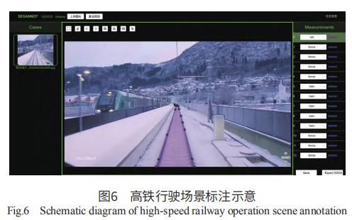 本文对高铁行驶场景进行类别标注,通常的场景是正常的轨道,对铁轨、护栏、列车、山脉等进行标注,并标记分类标签,得到标注数据集,用以训练图像识别算法。如图 6 所示,本标注系统对高铁行驶场景进行标注。