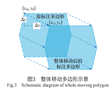 以图 3 中顶点 (x0,y0) 的移动为例,根据水平和垂直移动的距离 Δx、Δy,则新坐标 (x1,y1)=(x0+ Δx, y0+Δy)。针对第三个功能点“对整个标注多边形调整大小”,本系统通过提供调整点的方式,允许标注人员拖动调整点对整个标注多边形调整大小,与整体移动多边形功能的实现类似,对调整点注册拖拽事件,具体不再赘述,可以参考对整个多边形注册拖拽事件的描述。