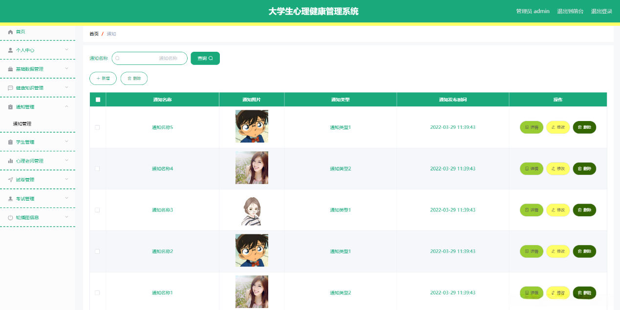 大学生心理健康管理系统划分为包含有管理员和普通用户两部分权限。其中,管理员负责管理和维护学生的基本资料数据,同时承担对心理健康相关记录(包括通知)的信息更新和维护责任。系统还为每位学生提供了实时沟通的功能,既可以与其他学生互动交流,也可以通过系统平台获取相关信息支持。对于普通用户而言,他们不仅可以随时查阅自己的考试记录,还可以浏览各类心理健康相关通知内容,并及时收到来自管理人员的反馈回复。