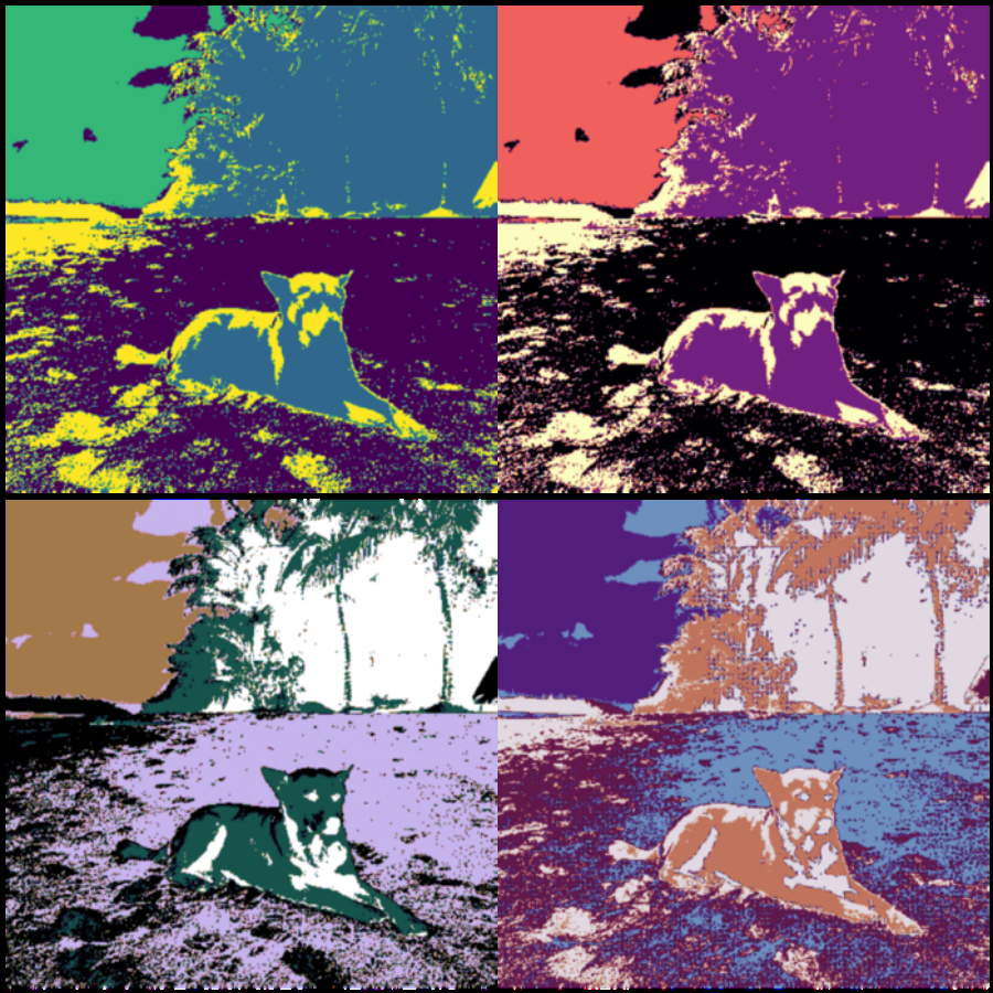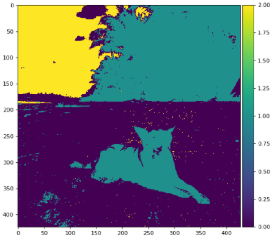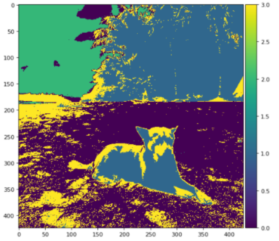 该算法根据R,G和B像素值分割图像。当然,一个缺点是这是一种完全不受监督的学习算法。它并不特别关心任何特定群集背后的含义。作为证据,我们可以看到第二和第四簇都具有狗的突出部分(阴影部分和未阴影部分)。也许运行4个集群过多,让我们重试集群,但将集群数设置为3。