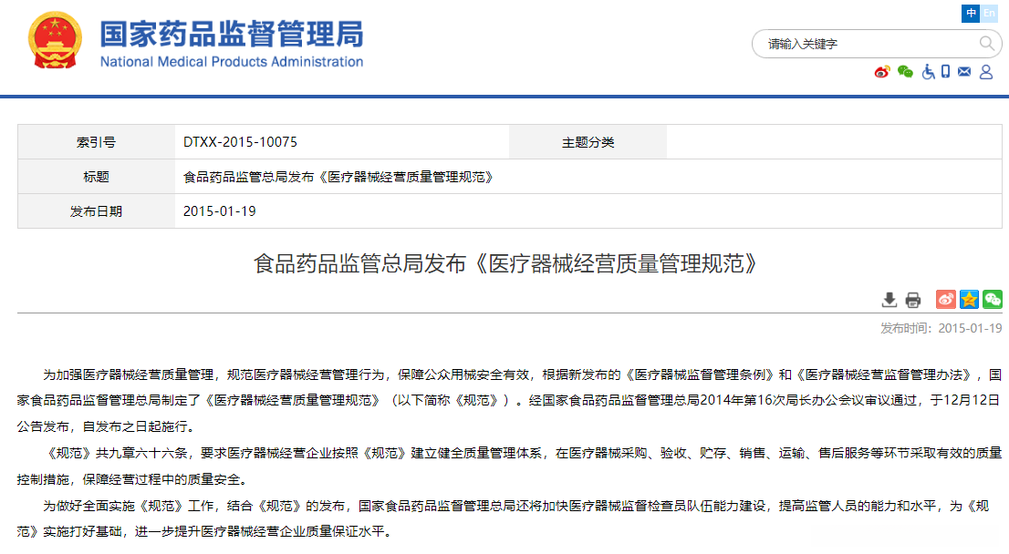 2015年1月,食品药监管理总局发布《医疗器械经营质量管理规范》,要求医疗器械经营企业按照《规范》建立健全质量管理体系,在医疗器械采购、验收、贮存、销售、运输、售后服务等环节采取有效的质量控制措施,保障经营过程中的质量安全。