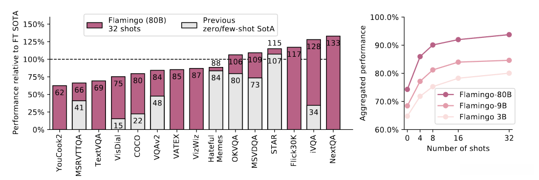 Figure 2 : Flamingo results overview. Left: Our largest model, named Flamingo, exceeds