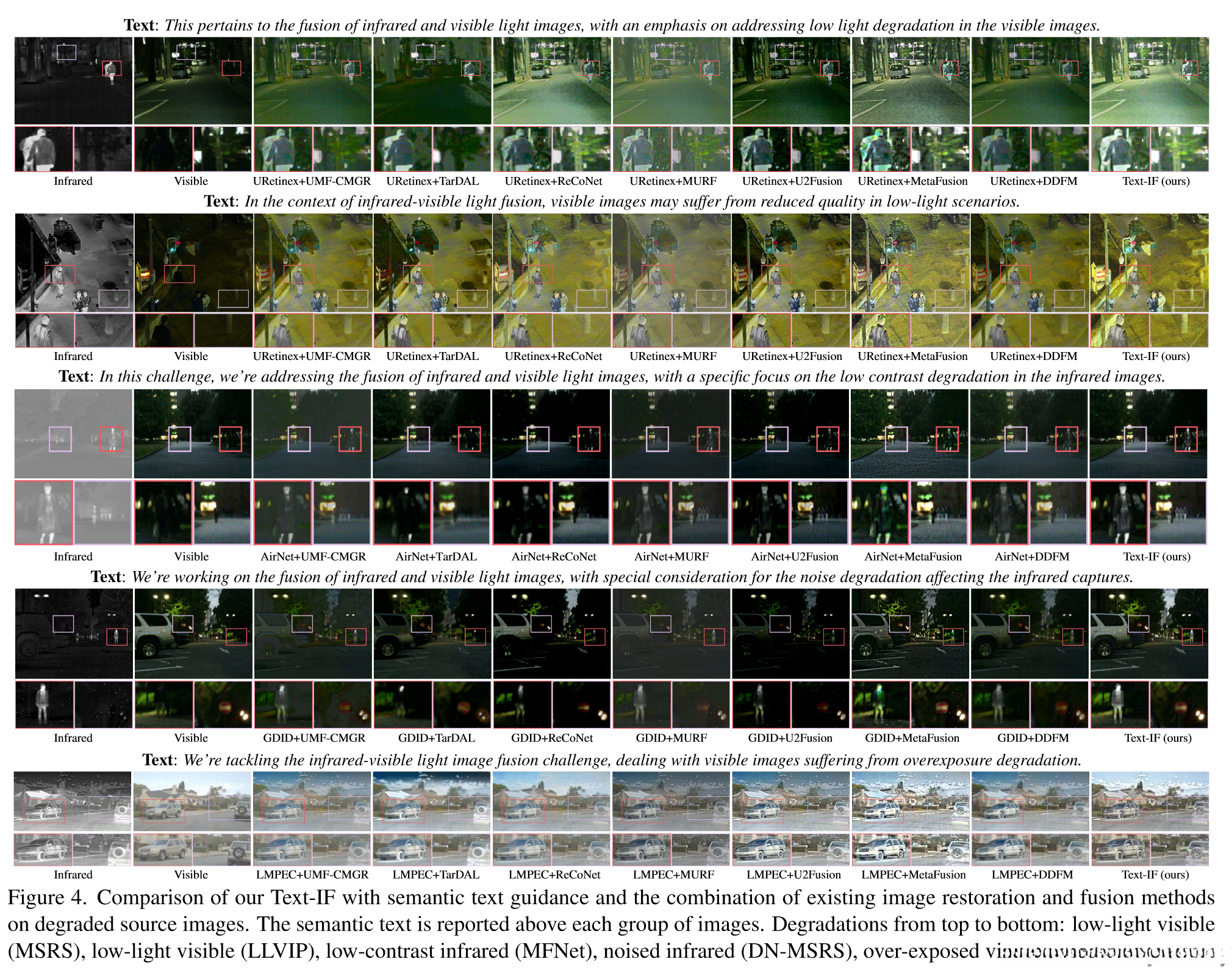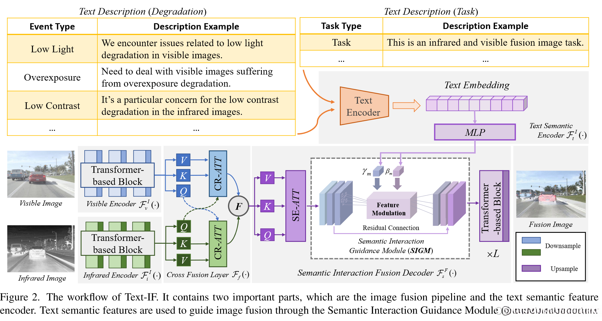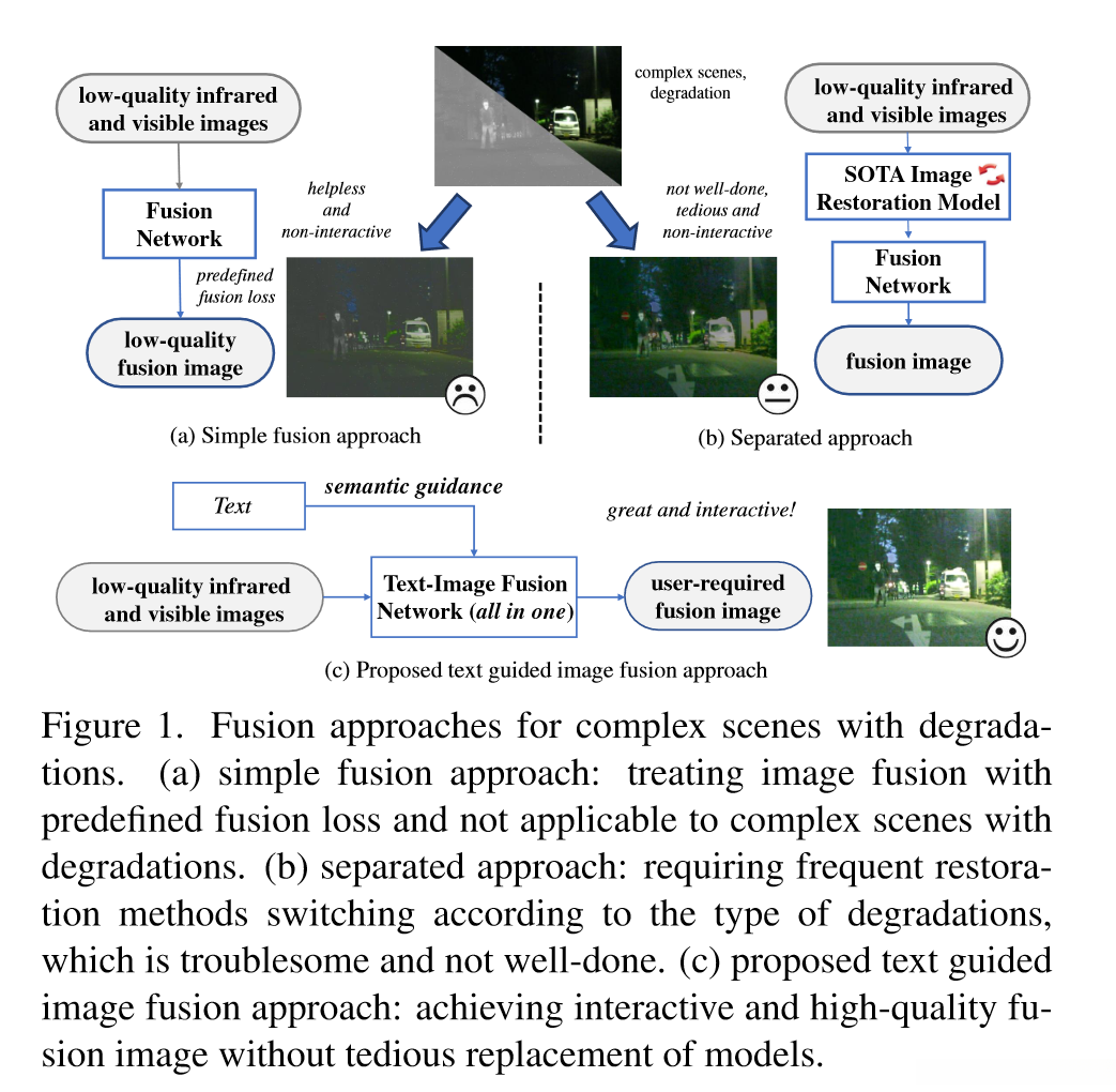 这表明 fusion 网络更倾向于学习固定不变的 fusion 策略。然而,在复杂环境下(如源图像退化)时,则这种任务模式就显得力不从心了。我们致力于通过引入文本来克服传统单一 fusion 结果所带来的局限性,并寻求一种能够有效指导图像 fusion 的新范式。随着文本语义信息的应用与引入,则该合成任务得以重新表述为: