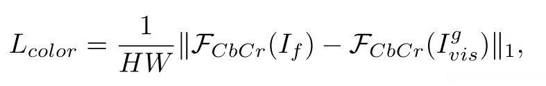 颜色一致性损失. 我们确保融合图像与可见图像在色彩上达到统一。将图像转换至 YCbCr 空间后,在Cb和Cr通道中应用欧氏距离进行限制。