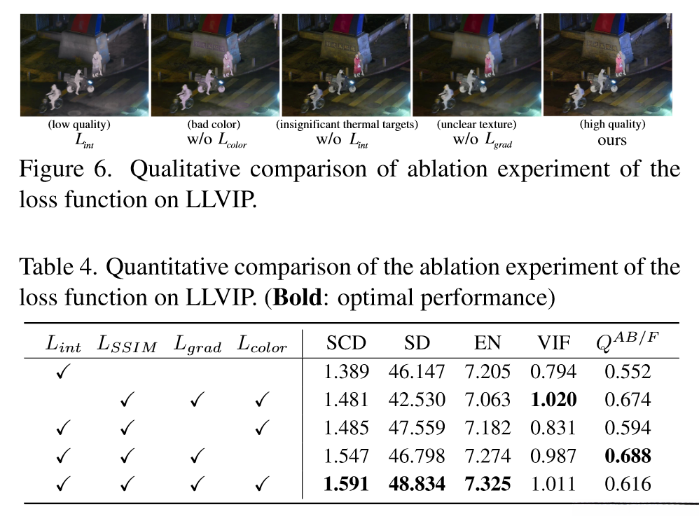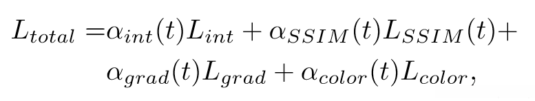其中\alpha_{\text{int}}(t)、\alpha_{\text{SSIM}}(t)、\alpha_{\text{grad}}(t)和\alpha_{\text{color}}(t)是与任务t相关的语义调节超参数;其融合效果受到重视。