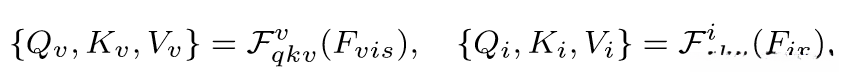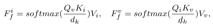 其中 dk 代表缩放因子。最终,在计算交叉注意力所得的结果基础上,我们通过 F0(f) = Concat(F_i(f), F_v(f)) 对其进行融合处理。