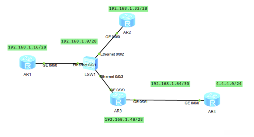 [r4-GigabitEthernet0/0/0]ip address 192.168.1.66 255.255.255.252