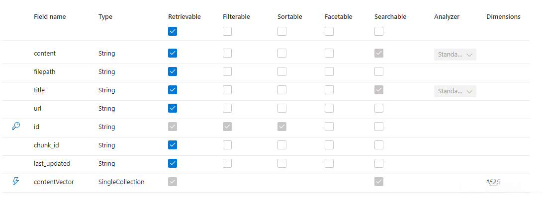 - 'contentVector' fied stores the embeddings of this main content (the output of a call to an 'text-embedding-ada-002' model with the same content which is stored in 'content' field) “contentVector”字段存储了此主要内容的嵌入(即,使用与“content”字段中存储的相同内容调用“text-embedding-ada-002”模型所得的输出)