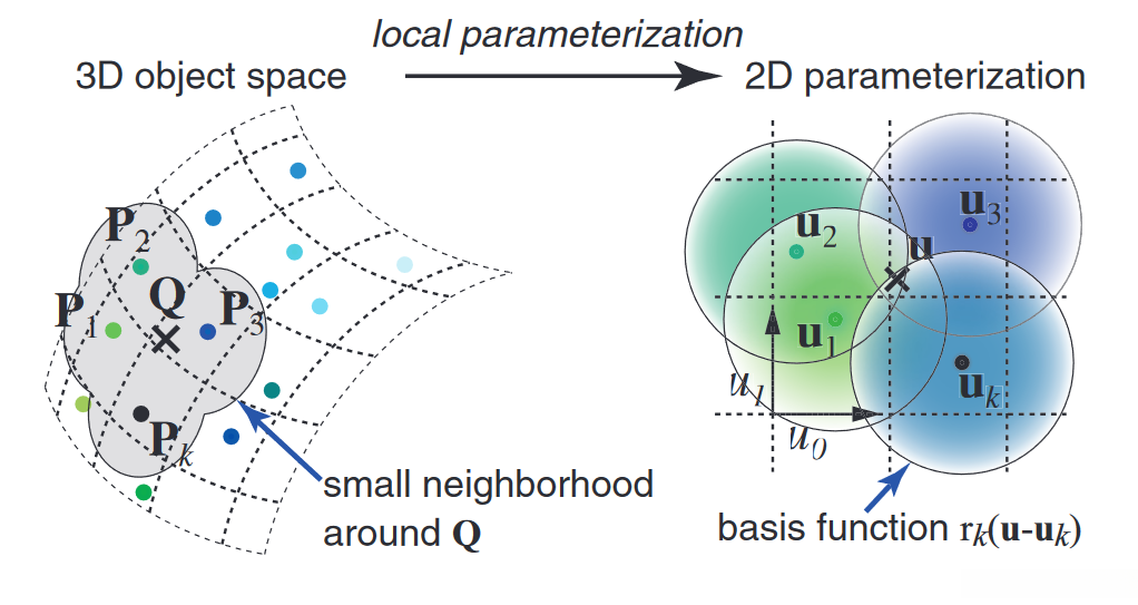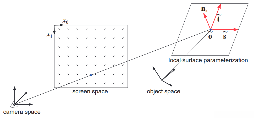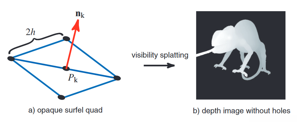 Note the dashed line means the shape of the surfel polygon can not be determined before rendering, but is view dependent.