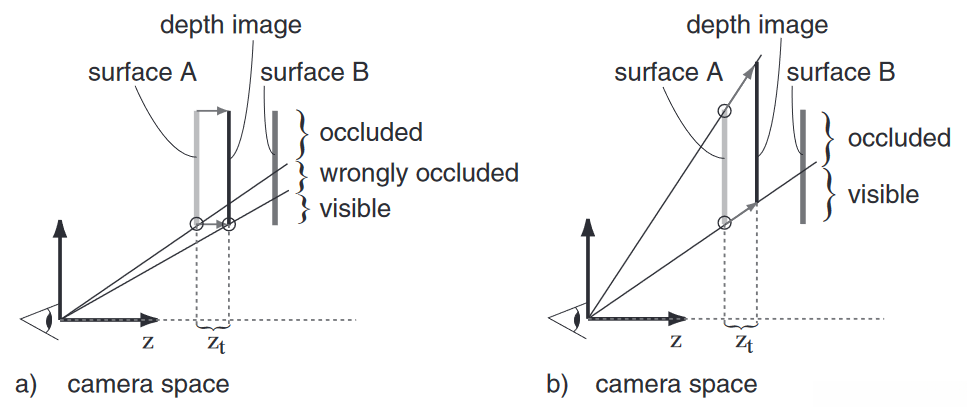 a) Translation along the camera space z-axis. b) Translation along viewing rays.