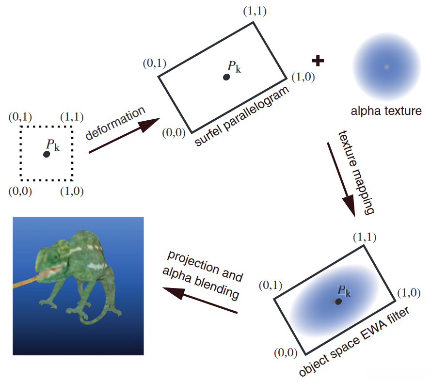 Elliptical weighted average (EWA) surface splatting is a technique for high quality rendering of point-sampled 3D objects. EWA surface splatting renders water-tight surfaces of complex point models with high q uality, anisotropic texture filtering.