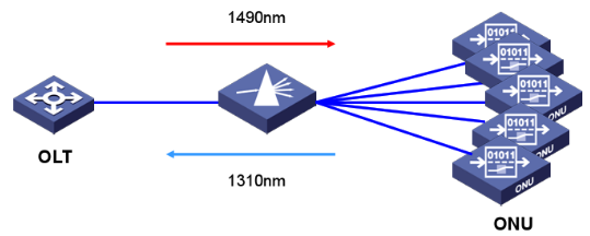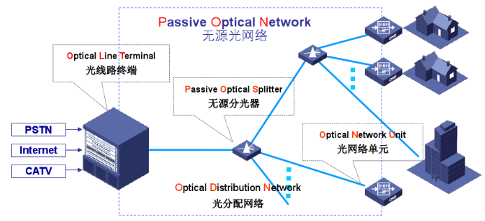PON是一种非对称的、点到多点(P2MP)结构;OLT(光线路终端)和ONU(光网络终端)所扮演的角色不同:→OLT相当于MASTER的角色,→ONU相当于Slave的角色;光源是光分配网络没有任何有源电子设备。