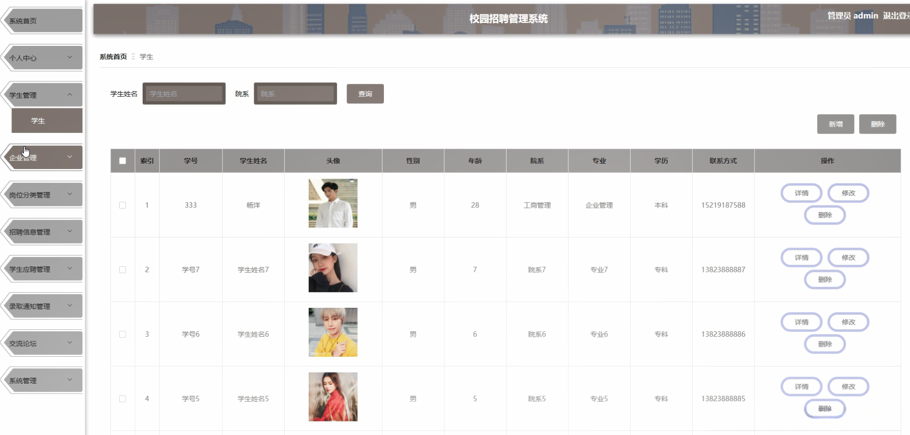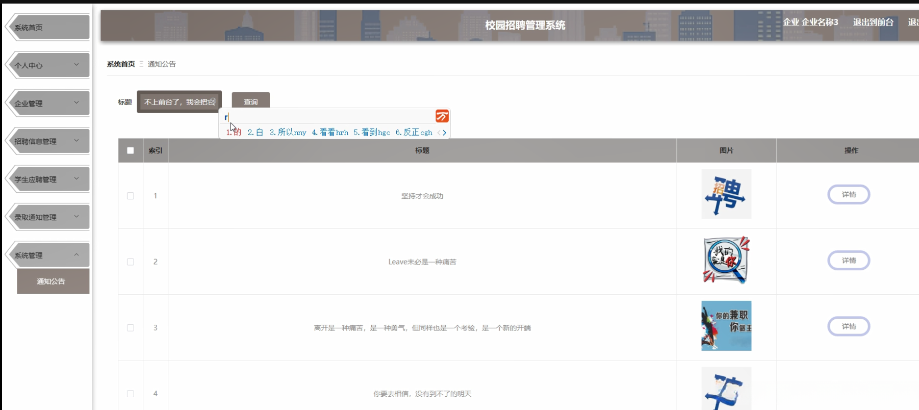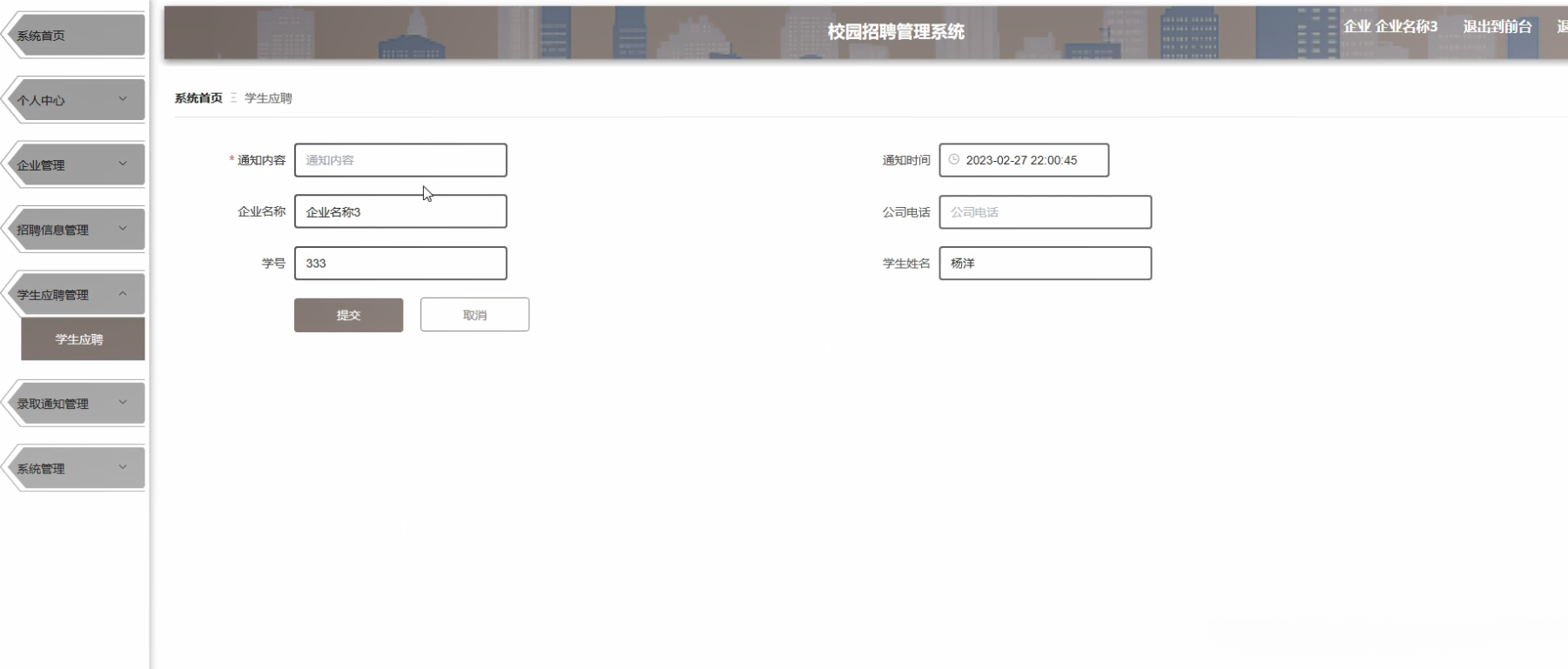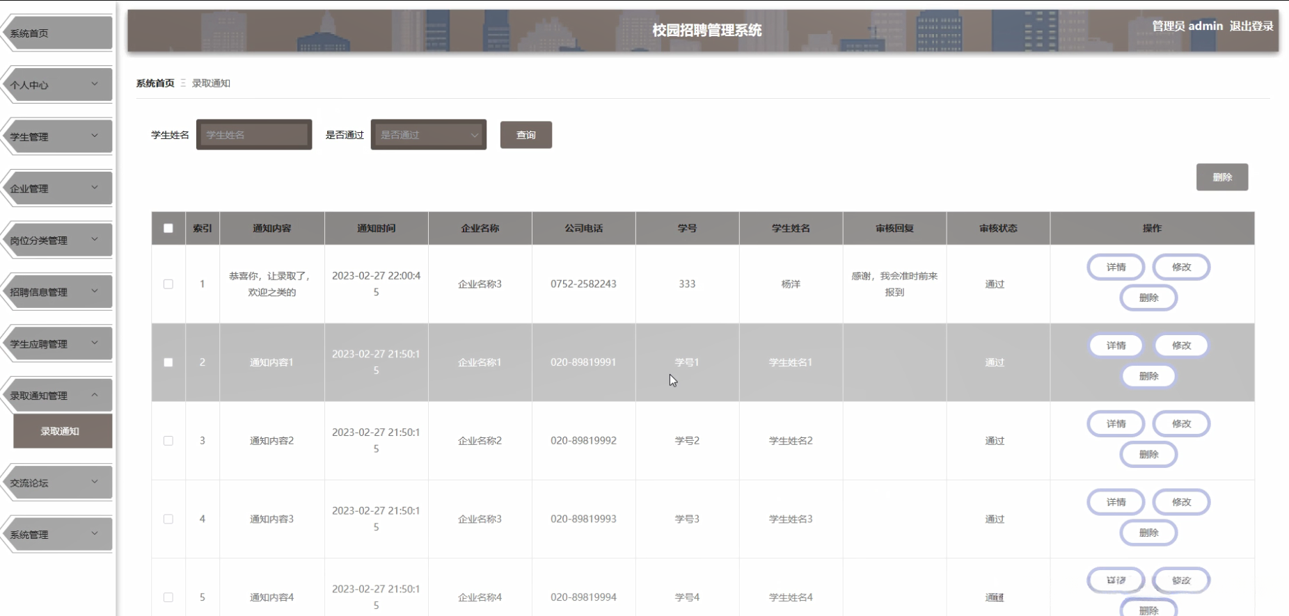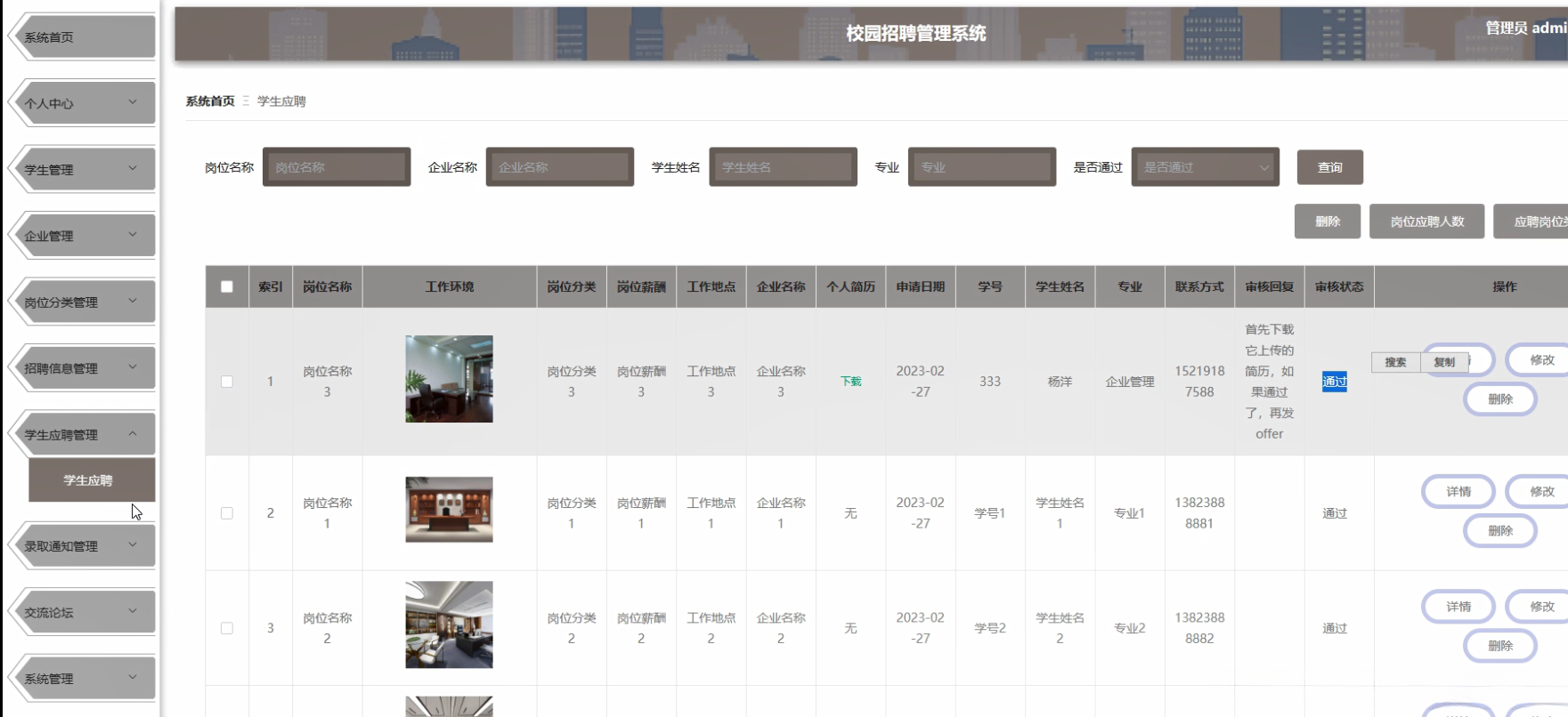 本研究的核心目标是开发一套功能齐全且易于操作的友好界面校园招聘管理系统。该系统需具备满足企业与学生需求的能力。系统将涵盖多个方面的工作流程包括学生信息管理企业信息管理岗位分类管理招聘信息发布学生应聘管理和录取通知发送。通过本项目的实施旨在提高校园招聘效率和质量促进校企精准对接推动校园招聘市场持续健康发展。