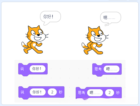 通过说……和思考……的积木引导角色发出声音或进行思维活动,并类似于漫画中的场景(左边的小猫在对话框内发出声音,在思维框内表现出思维过程),如图所示,并且其中所述的内容会在气泡中永久显示出来。