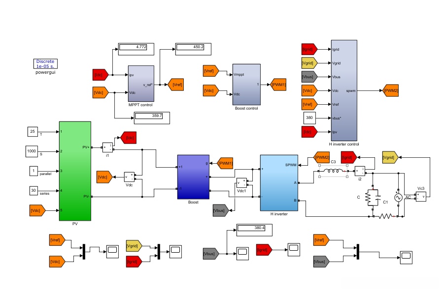 - Simulink建模:其Simulink模型通常包含IGBT开关模块、滤波电路以及控制系统模块。通过模拟逆变器的开关行为(如采用SPWM技术——正弦波脉宽调制),可以产生所需频率和波形的交流输出。