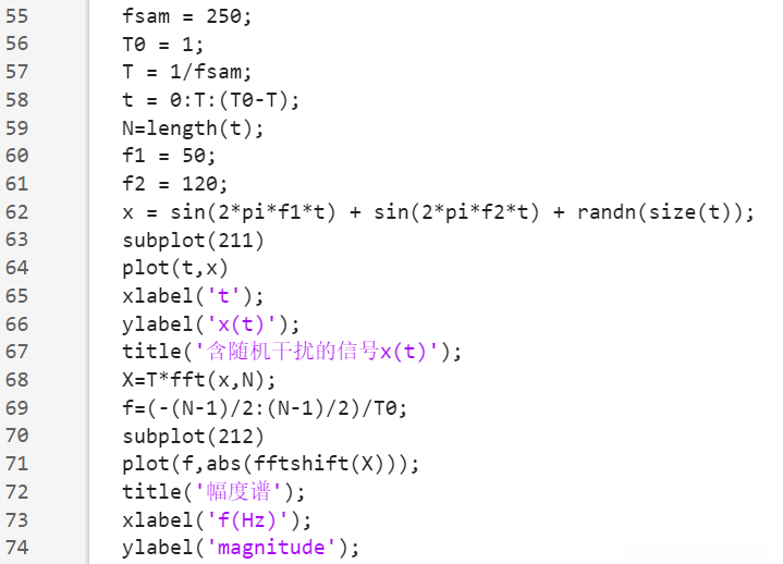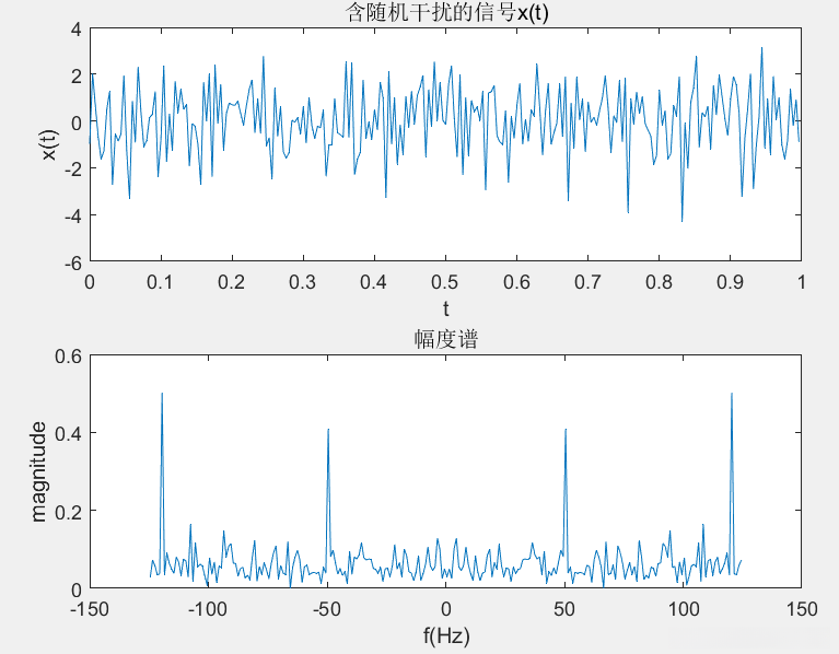 由于x(t)是混频相加的函数,可通过傅里叶变换得到各频率上的脉冲信号,即可检测出。本题多了干扰函数,但是干扰函数的幅度较小,不会对在50Hz和120Hz的脉冲信号有太大的影响,所以可以分辨出。