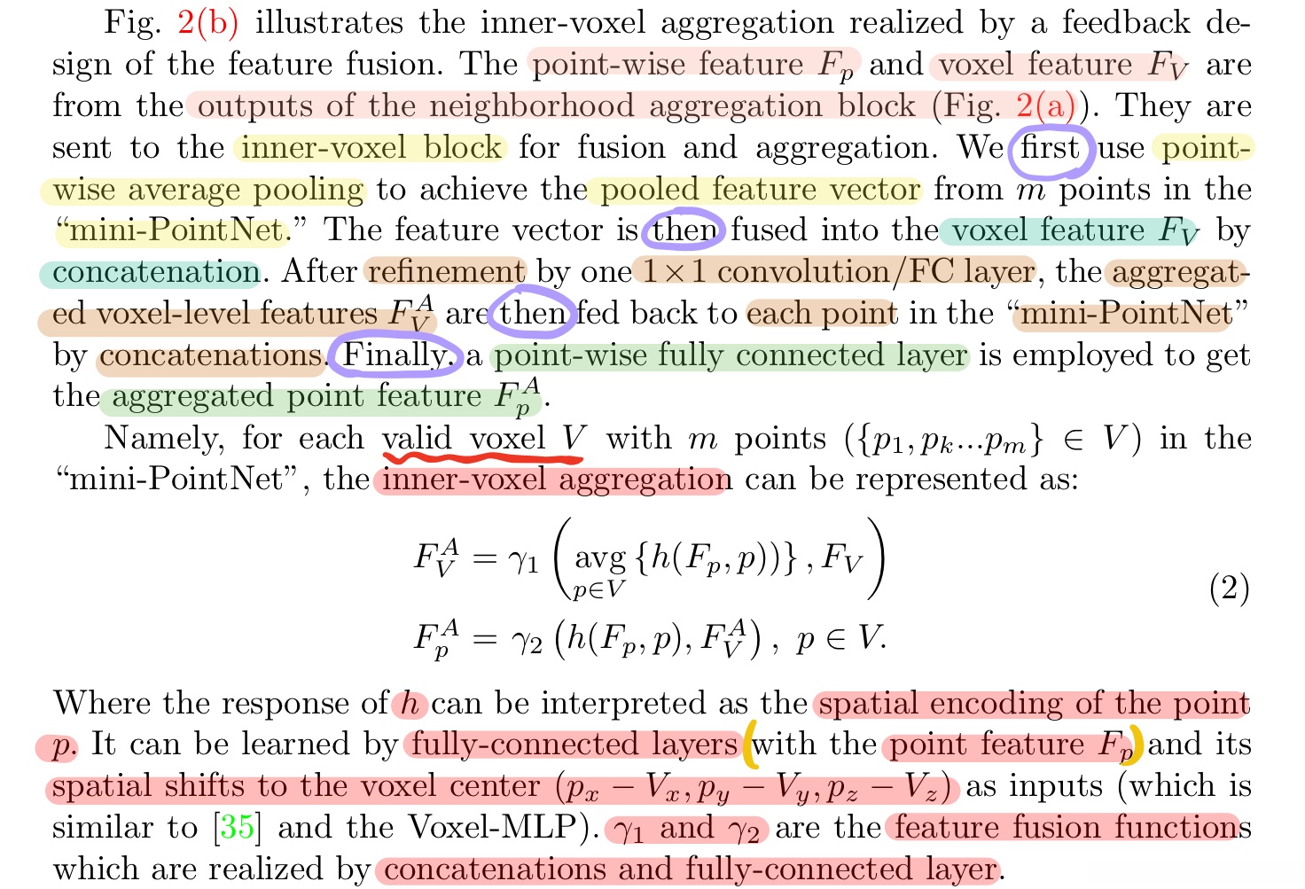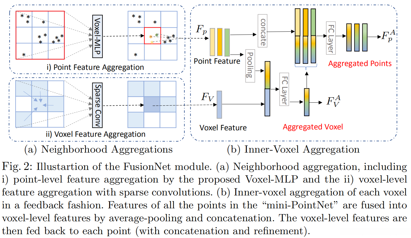 内部体素集合循环后,体素级特征和点特征被融合。然后将它们发送到下一个FusionNet模块/层以进行进一步聚合。
