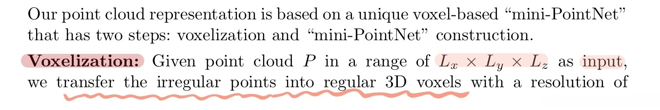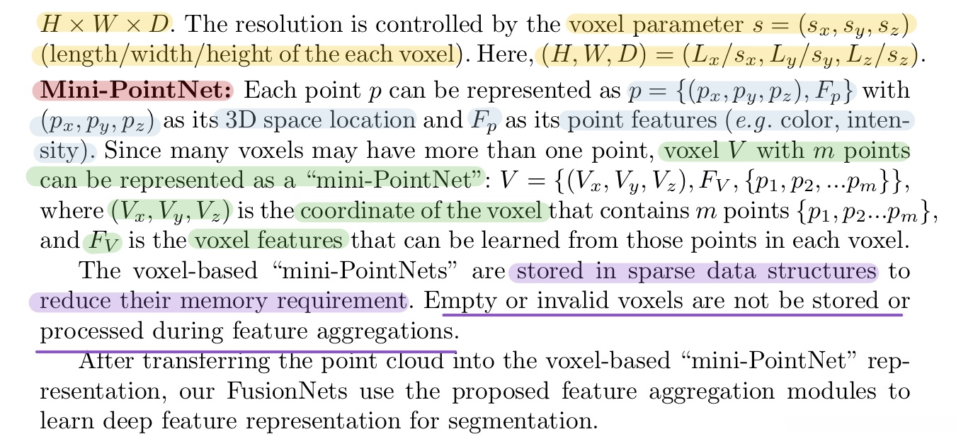- FusionNet利用独特的基于体素的“ mini-PointNet”进行点云表示和学习。它既可以实现邻域体素特征聚合,又可以实现细粒度的逐点特征学习。