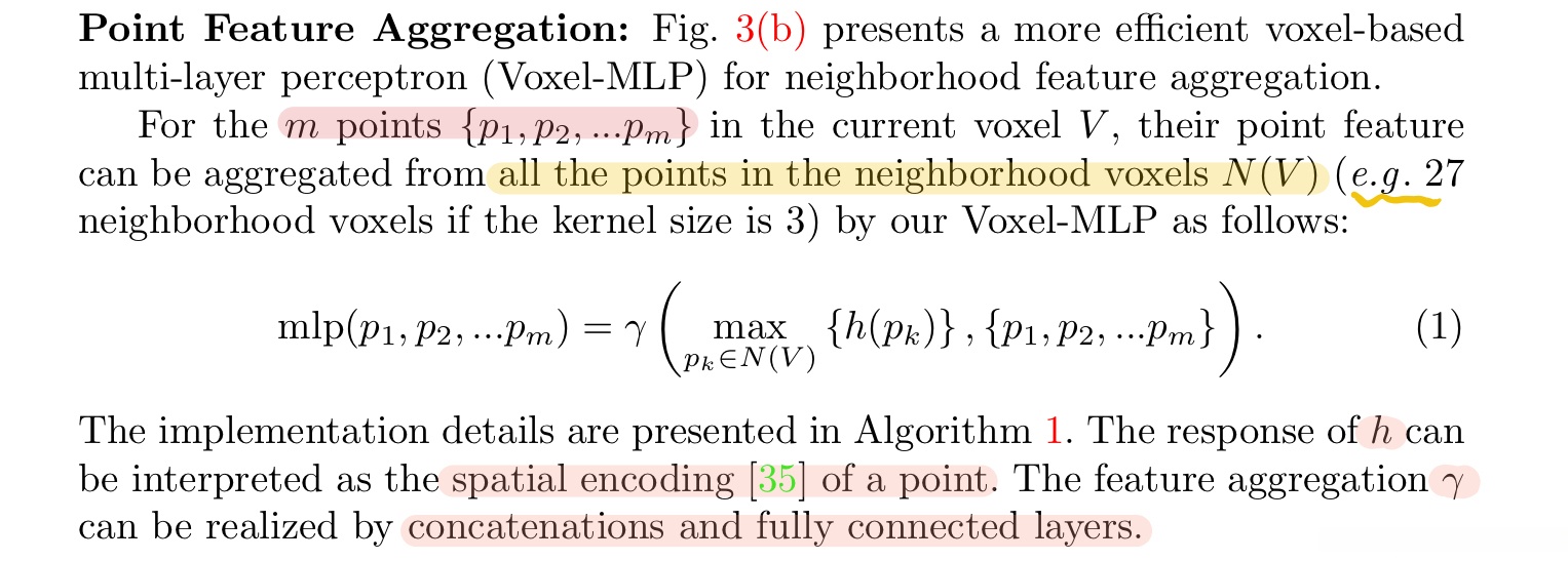 - Voxel-MLP的感受野由与卷积聚合相同的内核大小控制。例如,将内核大小设置为3时,将从27个邻域体素中选择邻域点。