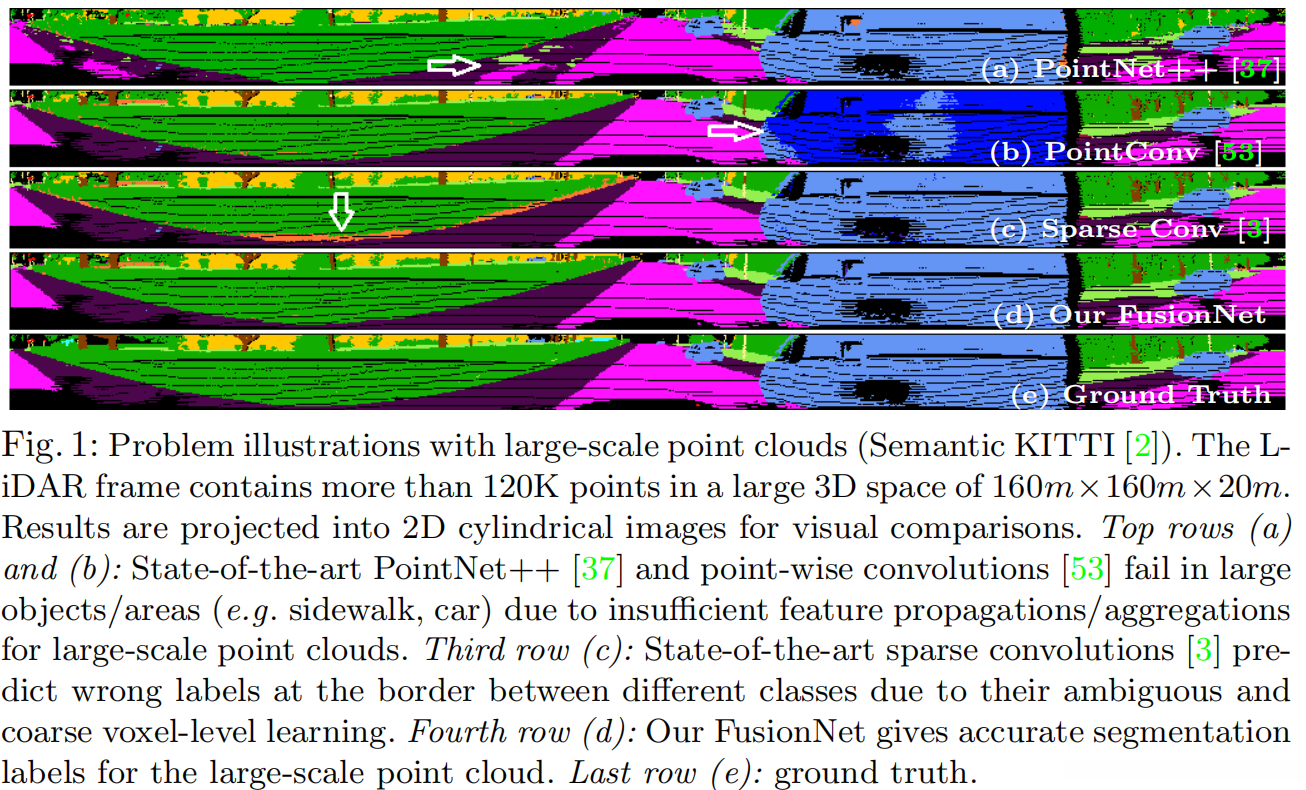 - 提出了一种深度融合网络架构(FusionNet),该架构具有一个独特的基于体素的“ mini-PointNet”点云表示形式和一个用于大规模3D语义分割的新特征聚合模块(融合模块)。