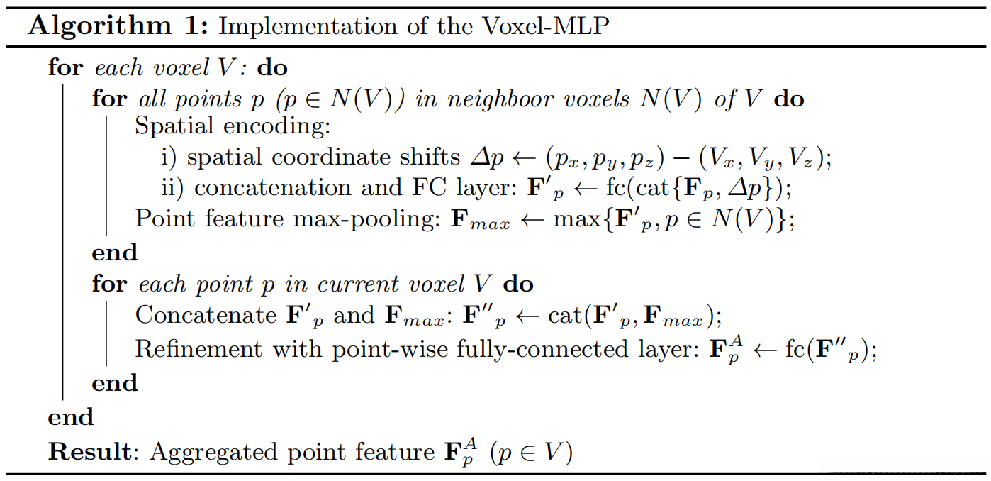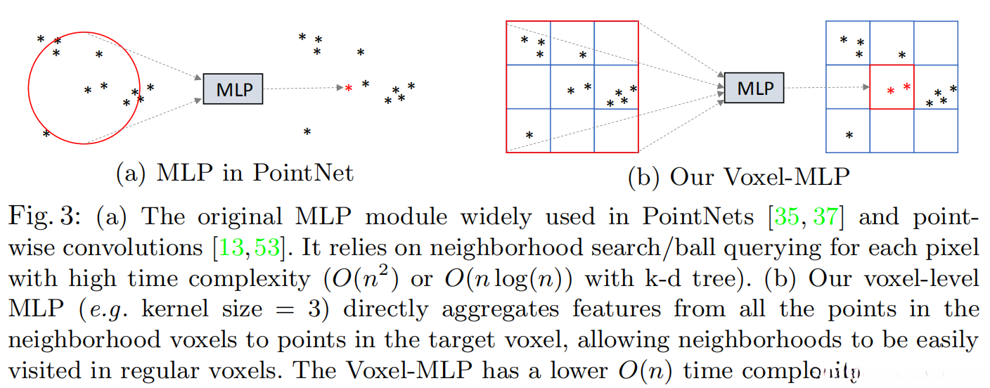 Voxel-MLP(图3(b))类似于在PointNets 和逐点卷积中广泛使用的原始MLP模块(图3(a))进行分割。但是,这些现有模型中的球查询,采样或KNN邻域搜索需要O(n2)时间复杂度来进行不规则点云中的点选择。尽管可以使用k-d树来加快O(nlog(n))复杂度,但为每层构建k-d树也将花费额外的内存和计算量。