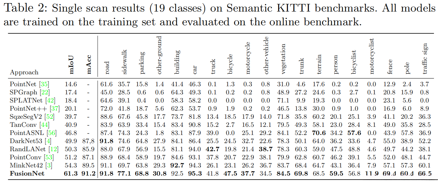 - FusionNet充分利用了稀疏属性,减少了内存占用。可以在一个GPU上对于一百万个点进行训练,达到大规模语义KITTI基准测试的最新精度。