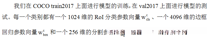 在阶段性训练分为两个阶段,分别为检测训练阶段和分割训练阶段。首先使用C=A并B中的边框标注训练一个Faster R-CNN,然后固定卷积特征和边框来训练掩膜head网络。这样的话每一个类别c的权重参数会被视为固定的内嵌向量,在第二阶段的训练过程中不会更新。这种方法的优势在于我们只需要训练一次边框检测模型,然后就可以快速的进行权重转移函数的设计了。