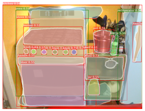 我们训练了一个大规模的MASK R-CNN,边框的标注来自于Visual Genome数据集,实例掩膜的标注来自于COCO数据集。Visual Genome数据集包含了108077张图片,超过7000种物体的边框标注,我们选出了3000种最常见的种类作为我们的C来进行实例分割,里面也包含了COCO数据集中的80种类别。把Visual Genome数据集中已经包含于COCO数据集的80种类别作为A,其余的2920种类别作为B,B中只包含边框的标记。