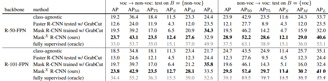 我们在COCO数据集上面评估了我们的方法,虽然只包含了80个类别,但是却有详尽的掩膜标注。我们使用AP(average precision)这个指标来严格评估模型。我们对这80种类别进行了两种不同类型的分割:1)把COCO中的80个类别分为20种包含于PASCAL VOC和60种没有包含于PASCAL VOC的,我们再把这个也称为voc和nonvoc。2)以随机的方式分配进行多次实验。