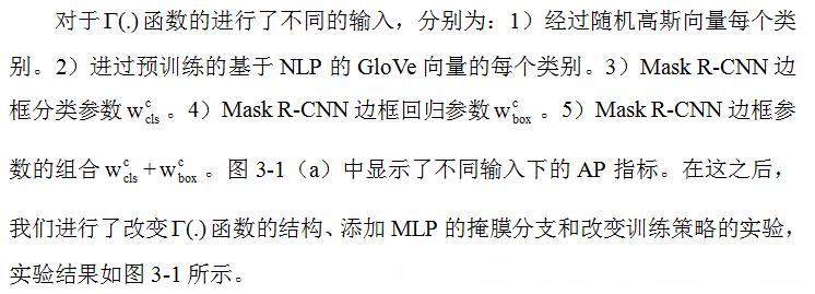 我们采用分阶段的策略来进行训练。首先使用Visual Genome中的3000种边框标注训练Faster R-CNN,使用ResNet-101-FPN作为backbone。在第二阶段,我们训练参数转移网络和MLP掩膜预测,配置为cls+box,2 layer,LeakeyReLU。掩膜head网络的预测使用从COCO数据集中分出来的80个种类。图4-1显示出来了指标结果。