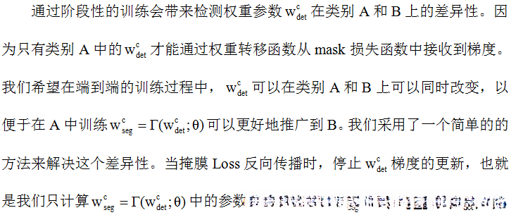 从图2-1可以看出来,我们使用标准的边框检测Loss函数在C=A并B的所有类别上训练了边框head网络,但是使用掩膜预测Loss函数只在A的类别上训练掩膜head网络和权重参数转移函数。给出了这些Loss函数之后就得到了两个截然不同的训练步骤,分别为阶段性训练和端到端训练。