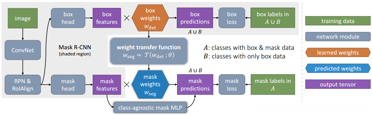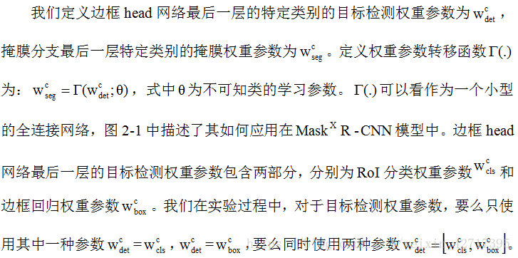 我们的方法是基于Mask R-CNN的,边框分支和掩膜分支的最后一层都包含了用于边框分类和掩膜预测的特定种类的参数。我们通过设计一个权重参数转移函数来从边框参数中学得掩膜参数,而不是把这两个分支分开单独训练,这个函数是和整个模型联合训练的。