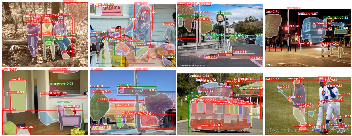 我们的方法分为两个过程:1)我们使用COCO数据集来训练半监督实例分割模型。特别地,我们把整个COCO数据集分为掩膜标记子数据集和与之互补的边框标记数据集。由于COCO数据集仅包含80种分割好的目标类别,所以定量的评估是准确可信的。实验结果表明,我们对从来没有在Mask训练集中出现过的类别的分割Mask AP可以在原有基础上面提升40%。2)我们在VG(Visual Genome)数据集的3000个类别上面训练一个大规模的实例分割模型。VG数据集包含了大量物体类别的边框标注,但是大量的分割类别是存在交叉的,并且标注也并不详细,这使得精确率和召回率变得很难测量。但是,我们使用VG数据集为大规模的实例分割模型提供了定性的输出。实现结果如图1-1所示。