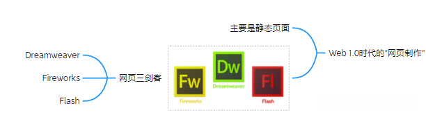 2005年,不管浏览器如何革新,但是网页的技术还是老样子,主要都是静态页面Web 1.0时代。没有后台数据库、不含程序和不可交互的网页,静态页面能使用户浏览网页但不能与服务器进行数据交互。仅仅停留在向用户输出信息。那个时候前端主要三剑客,或者说网页三剑客还是:Dreamweaver,Fireworks,Flash。也算是上一个时代的产物,作为小白我表示都没学过,不过有部分本科,或是其他院校计算机文化课还是开放了这类课程。