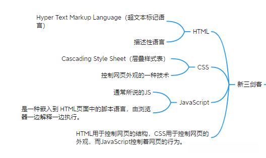 进入Web 2.0时代,就需要“新三剑客”了。前端三剑客分别是HTML、CSS和JavaScript(简称JS)
