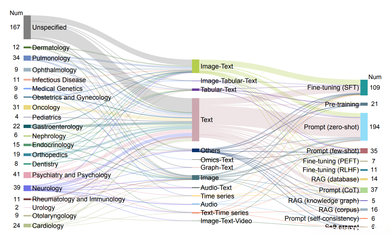 图 4 收录论文中临床专业(左)、数据模态(中)和 LLM 技术(右)之间的关联总结。
