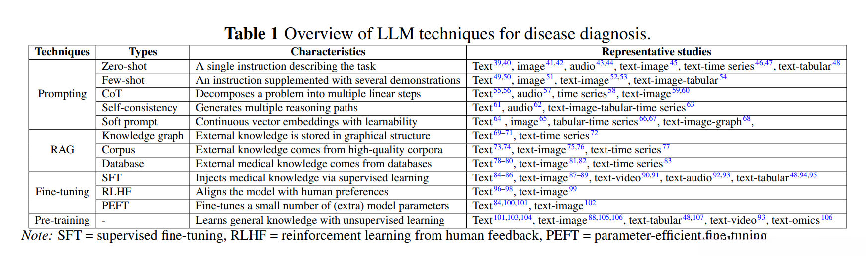 - 贡献 * 知识总结 :全面梳理了大语言模型(LLMs)在疾病诊断领域的应用情况,详细归纳了疾病类型、临床专业、数据来源以及技术手段等核心要素。