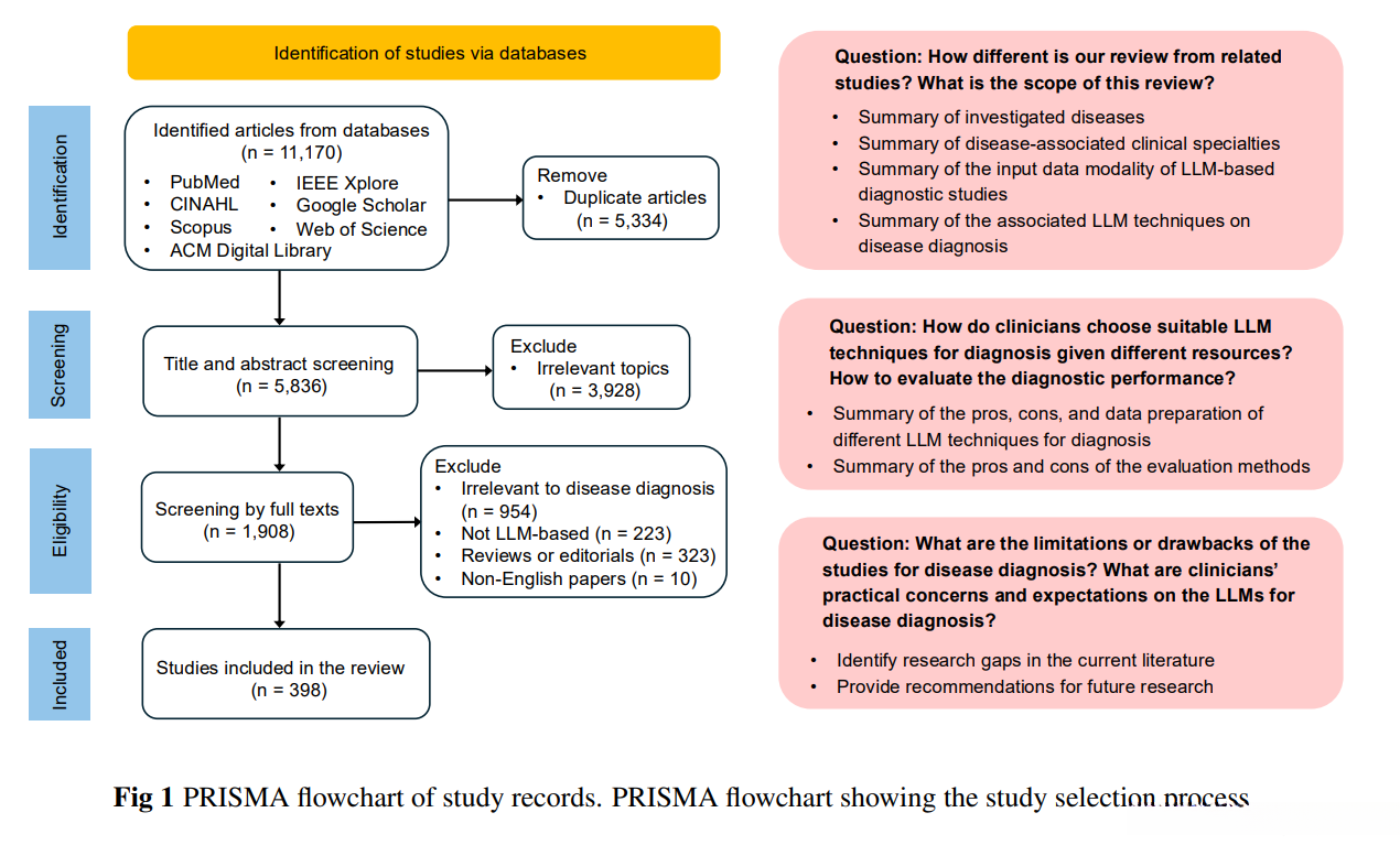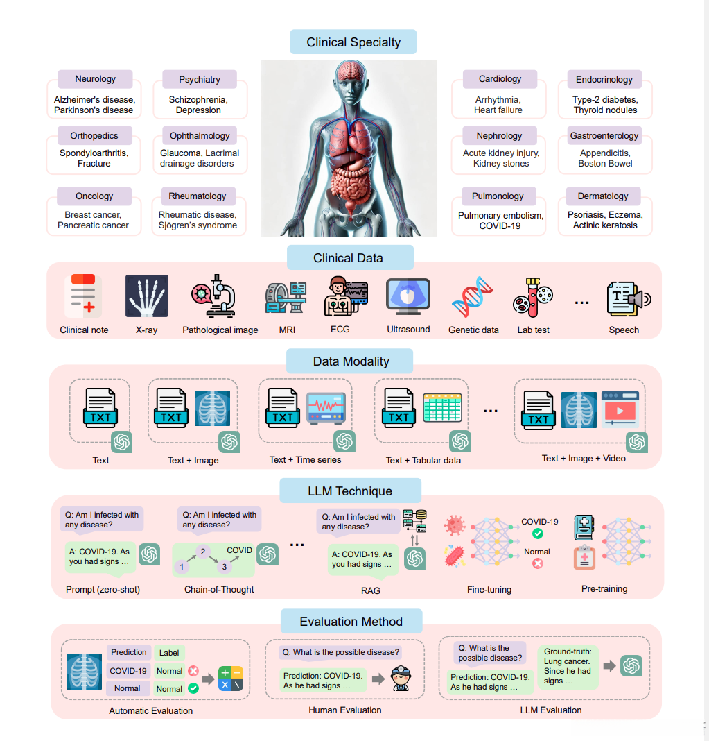 - 创新点 对LLMs在疾病诊断中的应用进行了系统性综述(从疾病类型到临床专业领域展开分析),覆盖了数据(即技术手段)、技术手段(即评估体系)等多个维度,并未见其他研究对此领域进行过如此全面地聚焦。