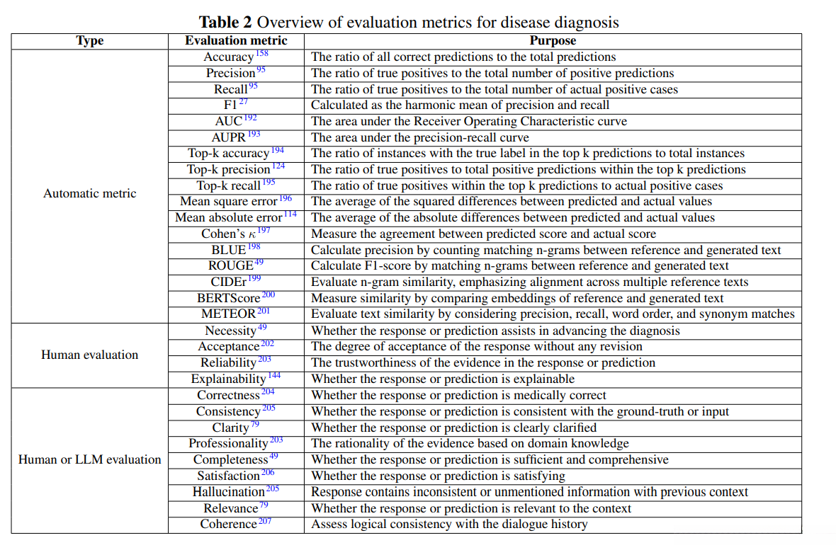大多数研究采用基于自动计算的方法来评估诊断的有效性。这些自动指标大致可分为三类**。第一类主要依赖于分类任务的指标如准确率精确率和召回率等这些指标常用于单一疾病预测任务例如Liu等人(27)应用AUC准确性以及F1评分来评估COVID-19的确诊效果第二类方法通常应用于多标签场景其中预测涉及多个潜在的疾病类别例如top-k准确性和top-k精确度两种指标如Tu et al.(194)所采用的例子所示第三类方法则适用于风险预测任务其中平均绝对误差(MAE)或均方误差(MSE)则衡量了预测值与真实值之间的平均差异程度