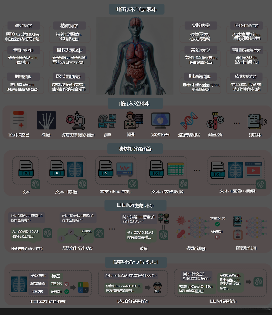 图 2 对调查范围进行了概述。该研究说明了涉及的临床专业、临床数据类型以及数据获取方式,并采用了LLM技术作为分析工具,并结合了评估方法以验证结果的有效性。研究仅涉及部分临床专科以及若干具有代表性的疾病案例
