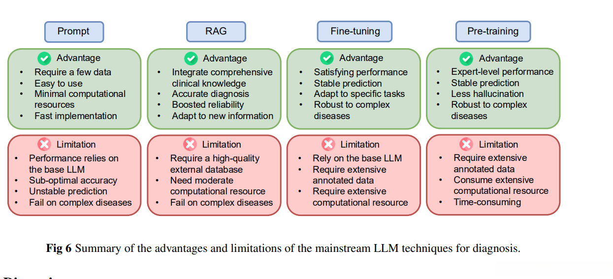具体而言,在注释数据有限的情况下,默认情况下提示工程具有高度的灵活性与有效性[24]。通常情况下设计一个适当的指令并辅以几个典型示例即可实现提示功能[214]。为了将RAG技术有效应用于诊断任务中,则必须构建一个全面且高质量的知识库[79,78,143,70]。这种知识库可以采用数据库、语料库或知识图谱等形式呈现[214]。有效的微调需要标记明确且领域特定的数据集[27];该数据集应包含反映目标诊断任务的关键标记实例(如带有标记的临床记录或医学图像),同时包含大量样本数量(27)。预训练阶段则需要使用广泛且多样化的数据源[54,94];这些数据源应涵盖丰富的医学信息资源(如临床笔记、医学文献)以及结构化数据(如实验室测试结果)。值得注意的是预训练数据的质量与多样性对于模型基础知识积累及其泛化能力至关重要。