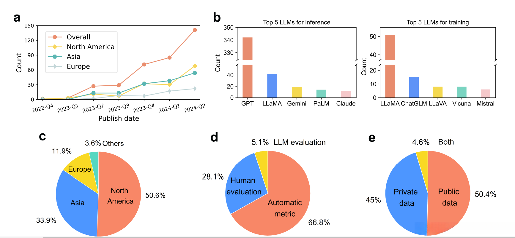 图 3 屾示出基于大语言模型(LLM)的诊断研究范围审查中的信息元数据。a 部分展示了这些诊断研究按季度划分的情况。由于 2024 年第三季度的数据存在缺失现象,因此统计数据仅覆盖了该年的第二季度内容。b 部分列出了主要采用的前五个通用性较高的 LLM 模型。c 部分则依据区域对相关数据源进行了分类整理。d 部分详细介绍了采用的不同评估方法(需要注意的是,一些论文可能会综合运用多种评估指标)。e 部分则是按照数据集所处隐私保护状态对已使用的数据集进行了细致分类
