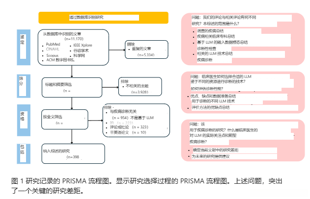 尽管这一研究领域虽受到广泛关注,但仍存在许多关键问题尚未深入探讨。例如,在基于LLM的诊断任务(Q1)中探讨了哪些疾病及其相关医疗数据?有哪些LLM技术被用于疾病诊断,并探讨如何选择合适的诊断技术(Q2)?如何选择适合的评估指标来衡量模型性能(Q3)?尽管有多篇综述论文回顾了LLM在医学领域的应用(30-37号文献),这些综述通常涵盖了多种临床应用场景,并未聚焦于疾病诊断。虽然有多篇综述论文回顾了LLM在医学领域的应用(30-37号文献),这些综述通常涵盖了多种临床应用场景,并未聚焦于疾病诊断。尽管有多篇综述论文回顾了LLM在医学领域的应用(30-37号文献),这些综述通常涵盖了多种临床应用场景,并未聚焦于疾病诊断。 Pressman等人(38)对LLM潜在临床应用方面进行了全面总结