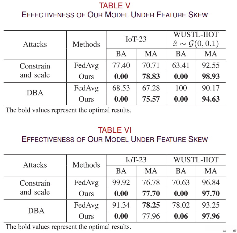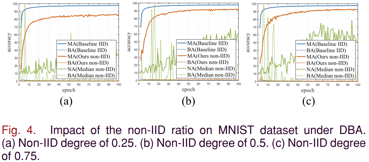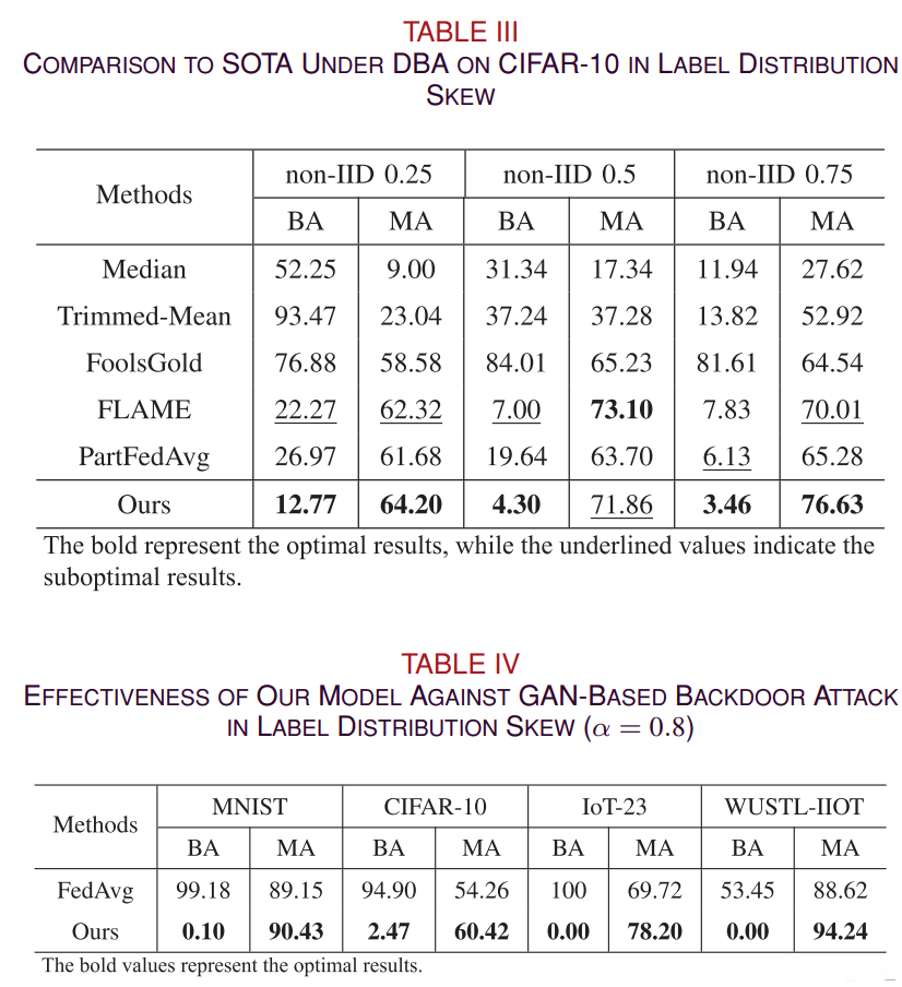 2、在非独立同分布场景下,现有的联邦后门防御策略难以区分具有较大异质性的良性客户端与恶意客户端