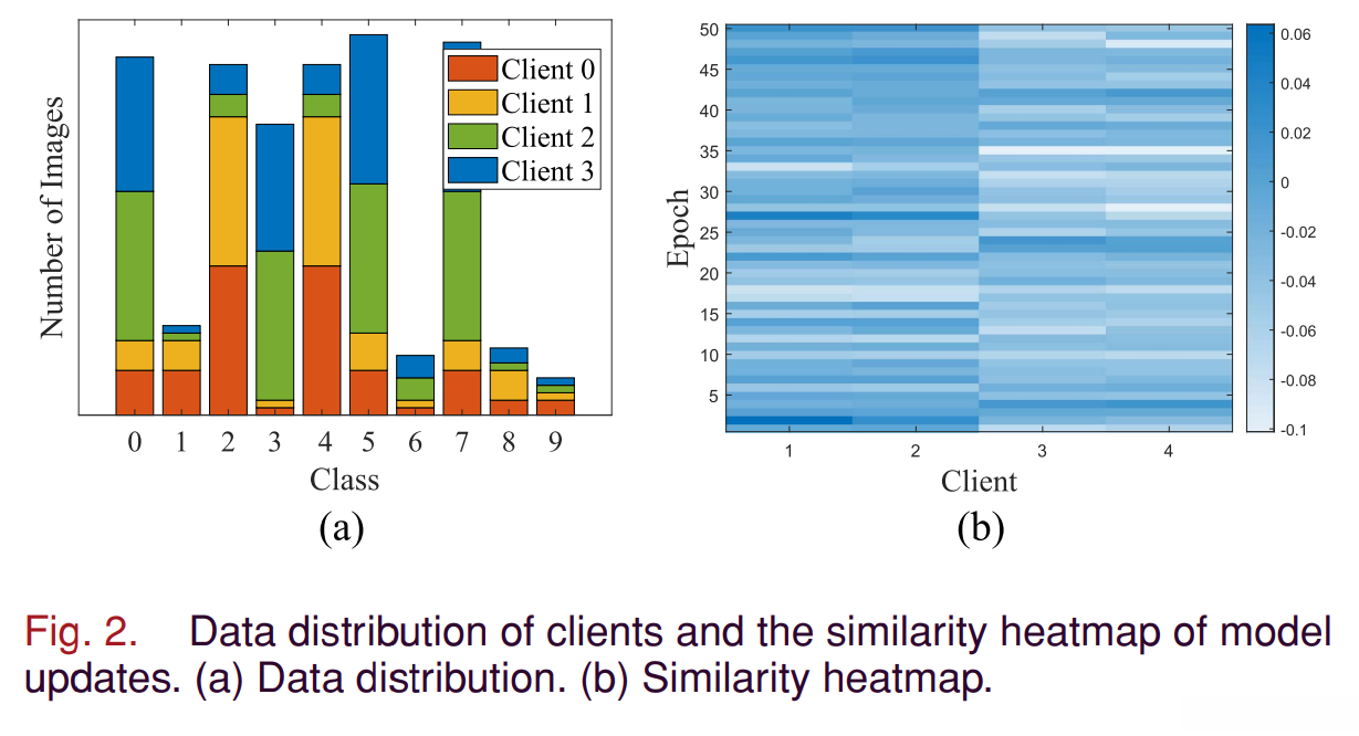 观察: 通过衡量四个客户端更新方向之间的余弦相似度,评估四个客户端模型在迭代训练过程中更新方向的一致性,图a为在MNIST数据集上四个客户端在各类别上的数据分布情况,图b为50轮余弦相似度热力图。得出结论数据分布越相似,模型在训练过程中更新方向越一致。