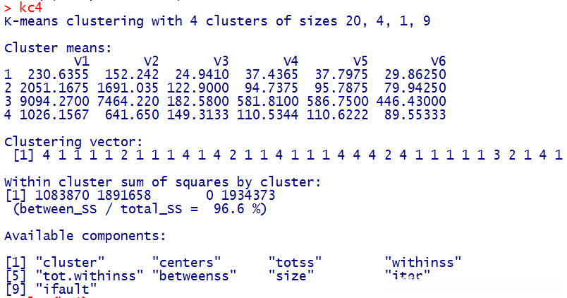 kc4<-kmeans(mydata,centers=4,nstart=1,trace=TRUE)#centers表示分成几类