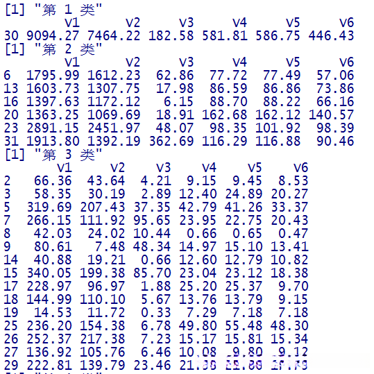 由Clustering vector可知34家公司的分类情况:第2、3、4、5、7、8、9、11、14、15、17、18、19、25、26、27、28、29、32、34为一类,第6、13、23、31为一类,第30家为一类,第1、10、12、16、20、21、22、24、33为一类。第三类公司利润最高,第二类公司利润最低。与系统聚类的分类结果虽不太相同,但两种聚类结果中第30家都是自成一类。
