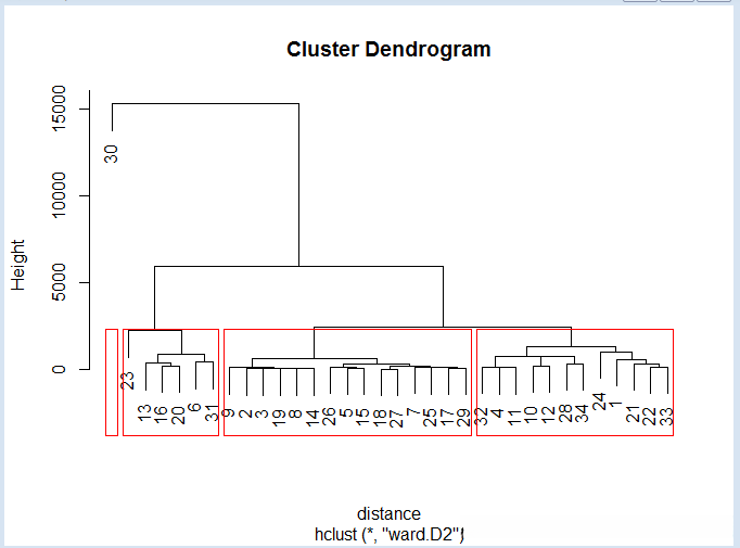 可以看出第30家公司自成一类,第6、13、16、20、23、31家公司为一类,第2、3、5、7、8、9、14、15、17、18、19、25、26、27、29家公司为一类,第1、4、10、11、12、21、22、24、28、32、33、34家公司为一类,第一类公司利润最高,第三类公司利润最低。